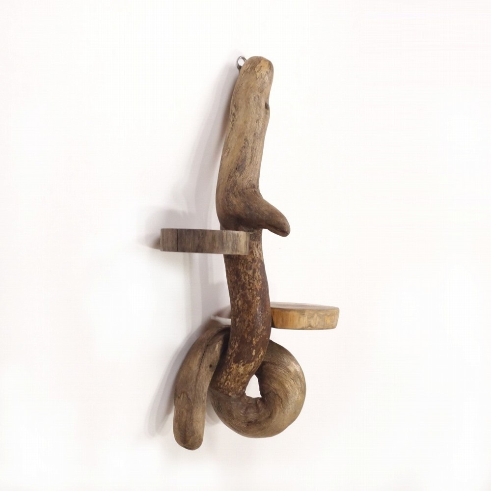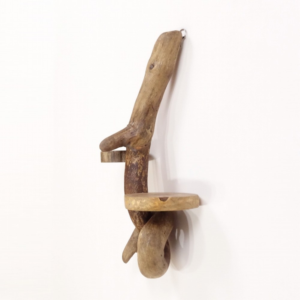 軸となる個性的な流木に 丸太流木を取り付けた、壁掛け飾り棚です。
