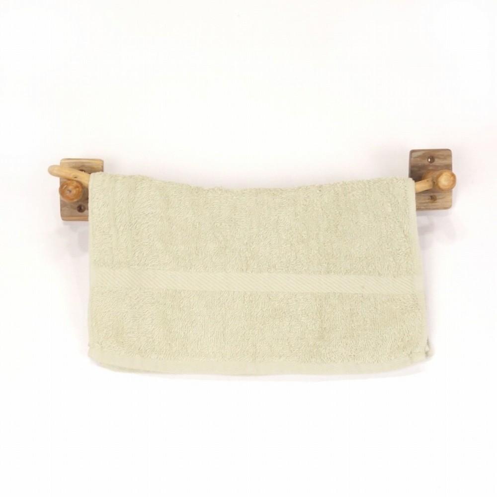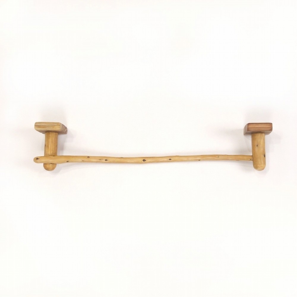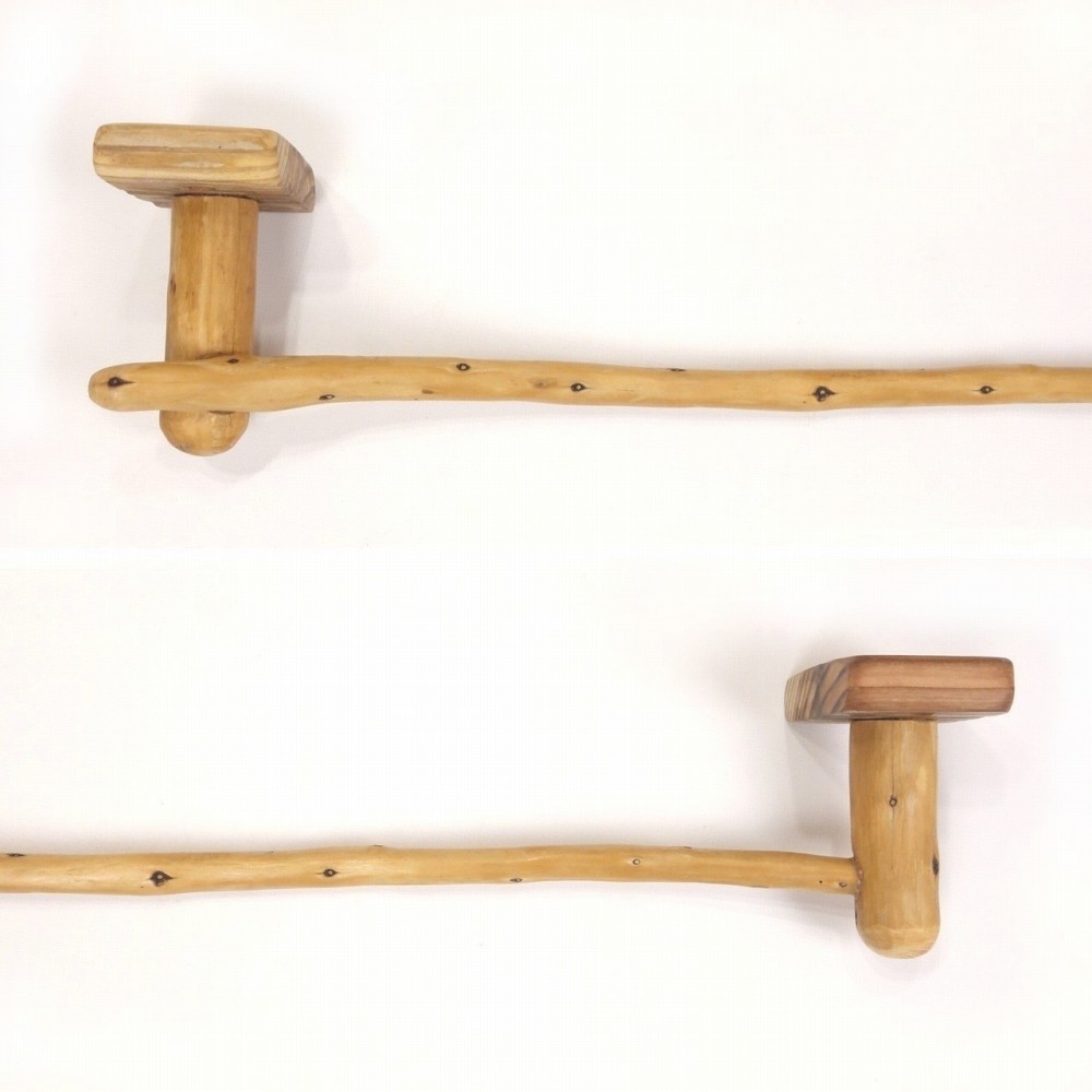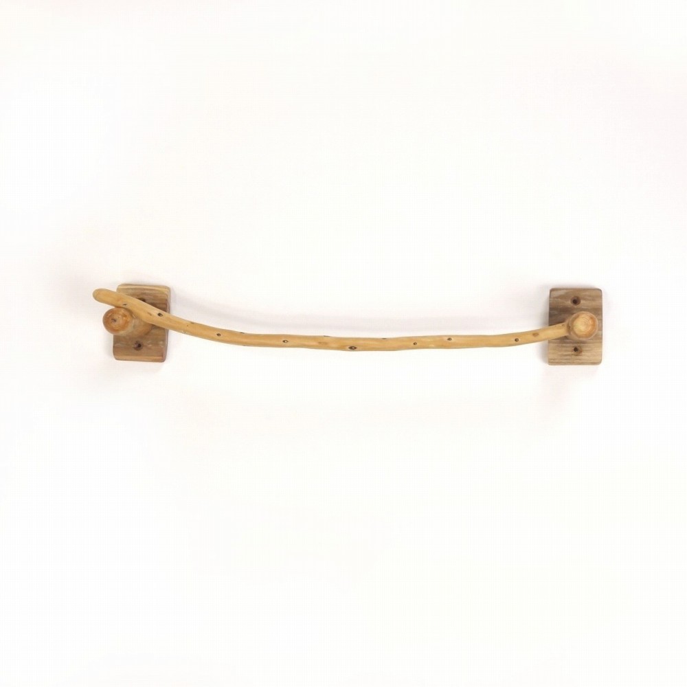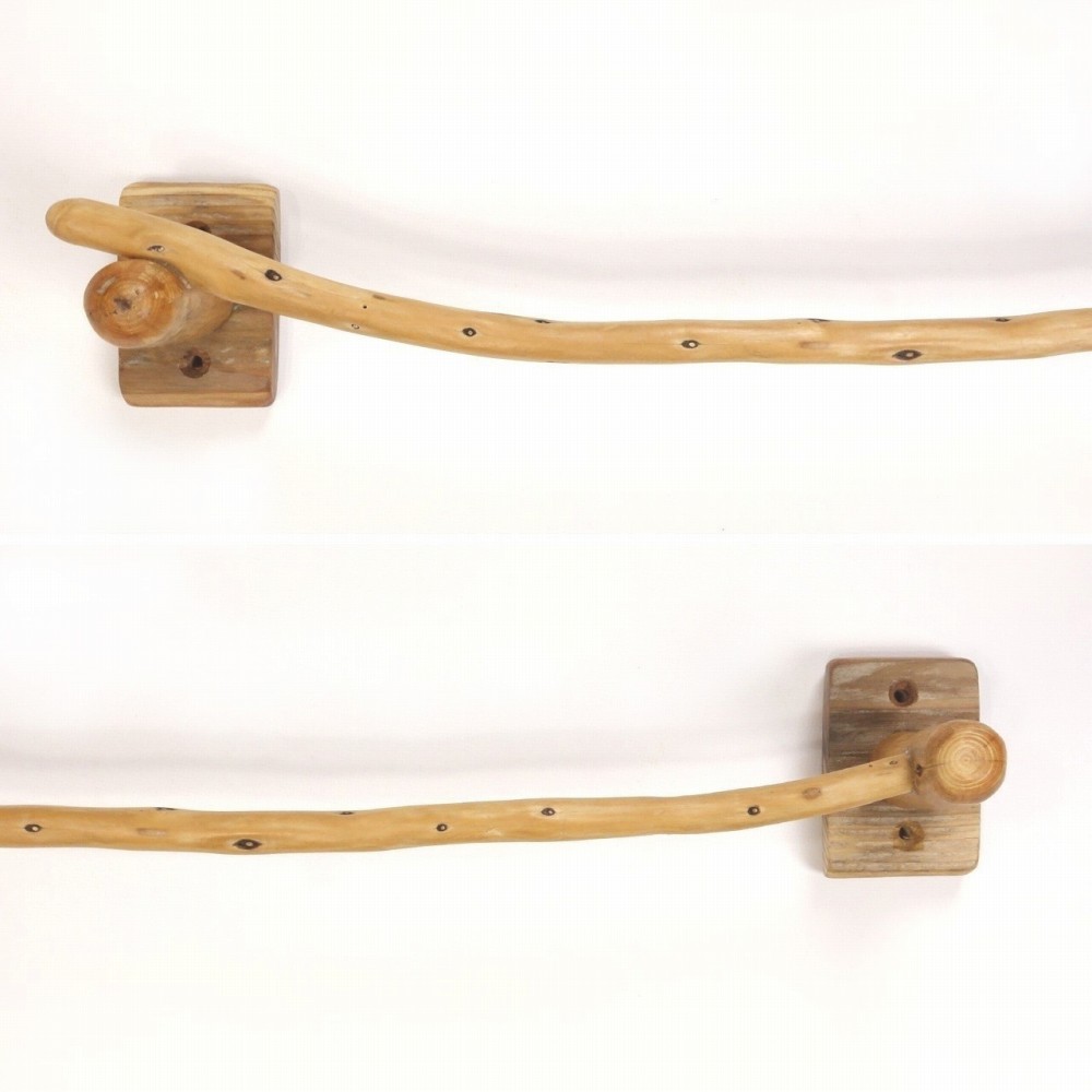 タオルを掛けるハンガー部は ゆるく湾曲した細枝の流木、たくさんの枝跡が水玉模様のように点々と見られます。