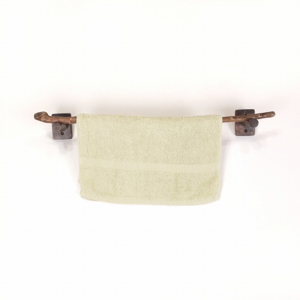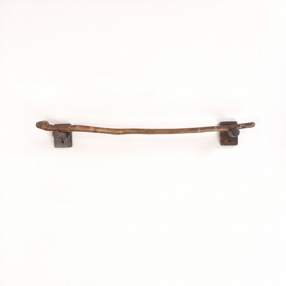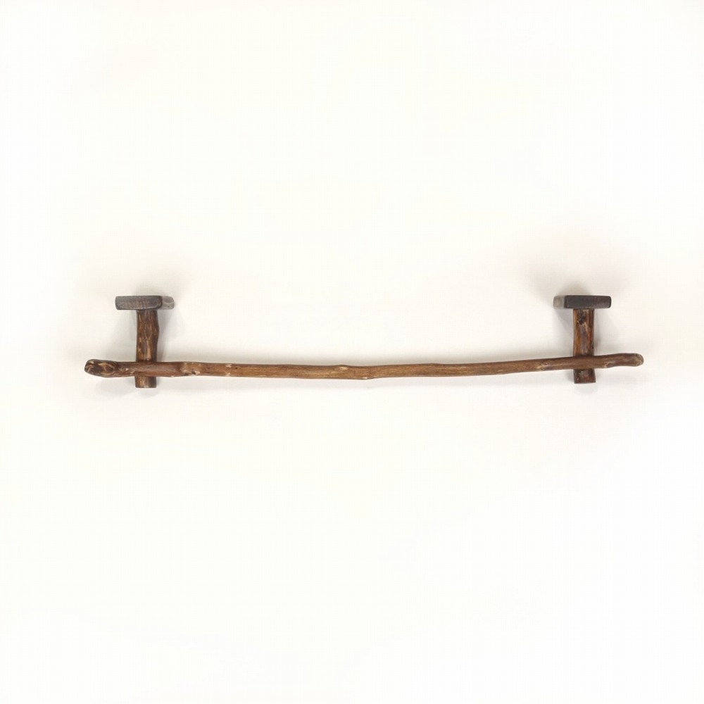 タオルを掛けるハンガー部は わずかに湾曲した細枝流木、左側の先端は枝跡がふくらみ 丸くなっています。