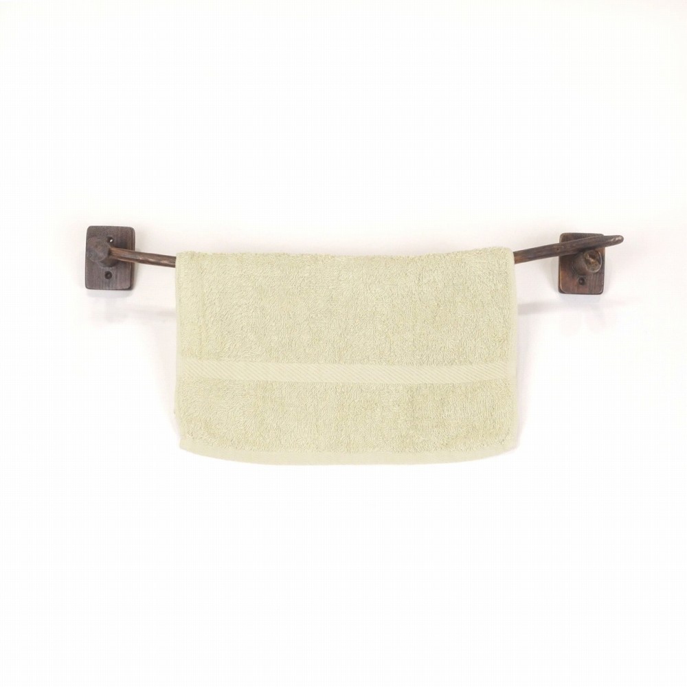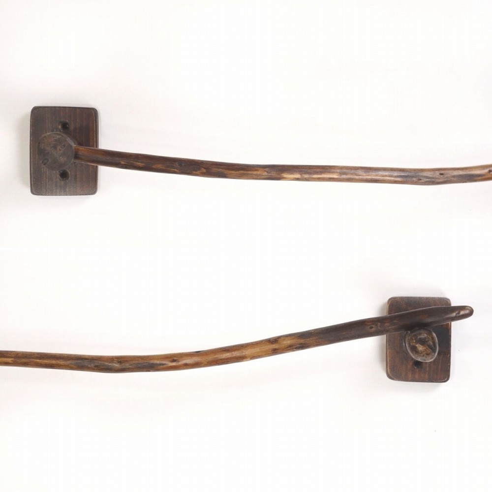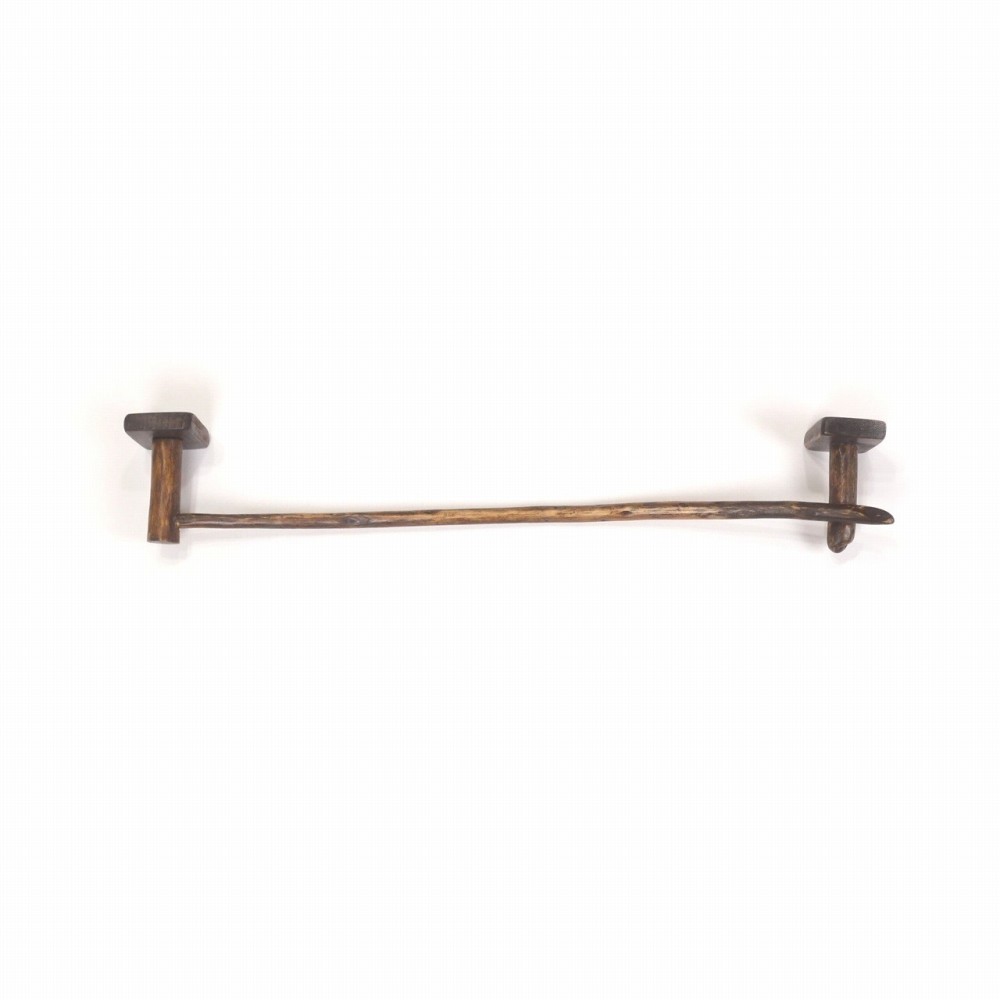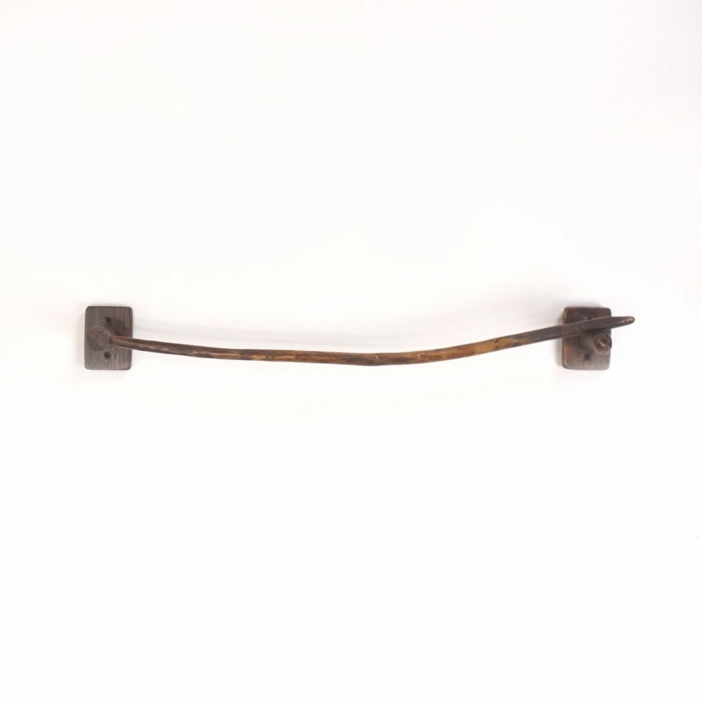 タオルを掛けるハンガー部は ゆるいカーブの細枝流木、右側の先端は欠け削れがあり細く流れます。